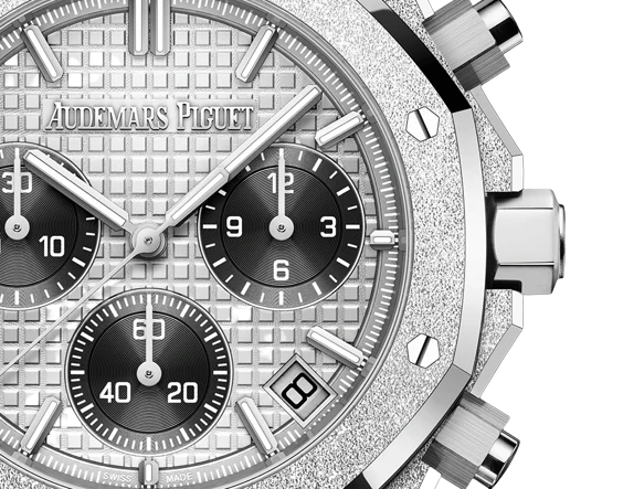 This Japan-dedicated 41 mm Chronograph features an 18-carat white gold case and bracelet decorated with Frosted Gold as well as a grey "Grande Tapisserie" dial contrasted by black counters. Hammered 18-carat white gold case, glareproofed sapphire crystal, screw-locked crown. Grey dial with “Grande Tapisserie” pattern, black counters, white gold applied hour-markers and Royal Oak hands with luminescent coating. Hammered 18-carat white gold bracelet with AP folding clasp.