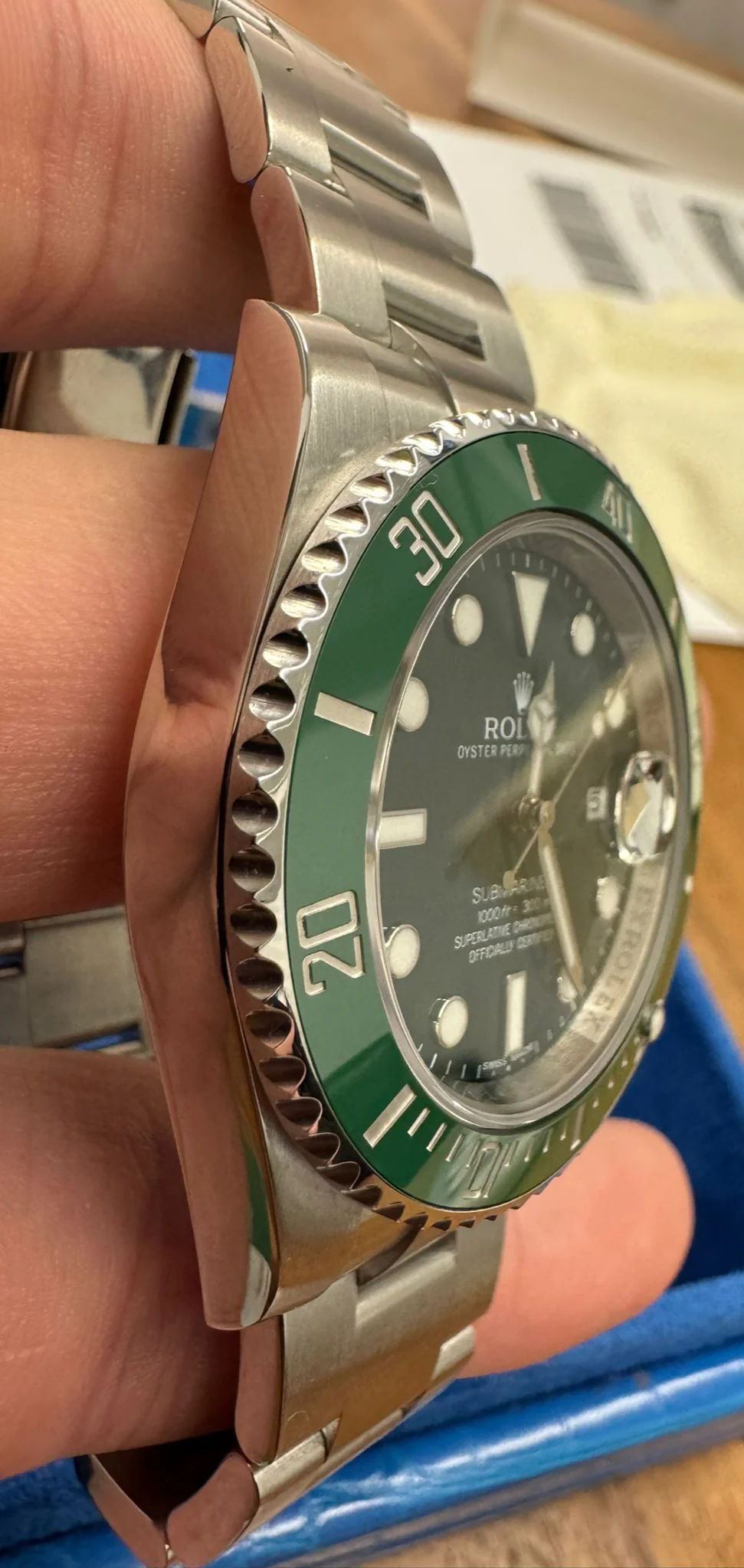 40mm 904L stainless steel case, unidirectional rotatable green Cerachrom time lapse bezel, green Hulk dial, Chromalight luminescent hands and hour markers, and Oyster Glidelock bracelet. Water resistant to 1000 feet. New design introduced at Baselworld 2010. New features include redesigned 904L steel case and virtually scratch proof Cerachom bezel.